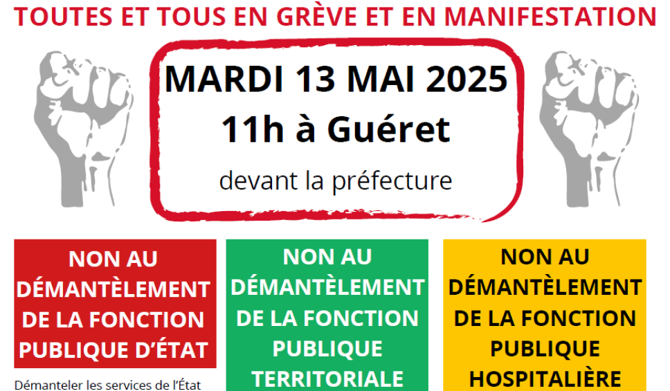 Nos organisations syndicales, constatant la grande insuffisance des réponses faites par le gouvernement à nos revendications exprimées très massivement notamment dans la grève et les manifestations du 5 décembre dernier, appellent les personnels de la Fonction Publique à être en grève et dans la rue le mardi 13 mai à Guéret, à 11h devant la Préfecture   ...